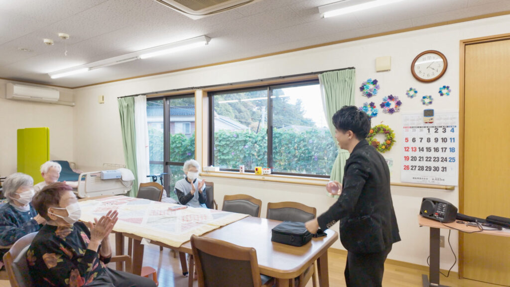 2025年10月28日、秋晴れの空の下、島根県隠岐・西ノ島町にある高齢者向け施設「デイサービスセンター・シオン」様にてマジックショーを開催いたしました。