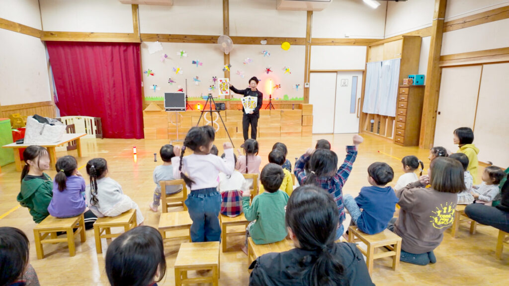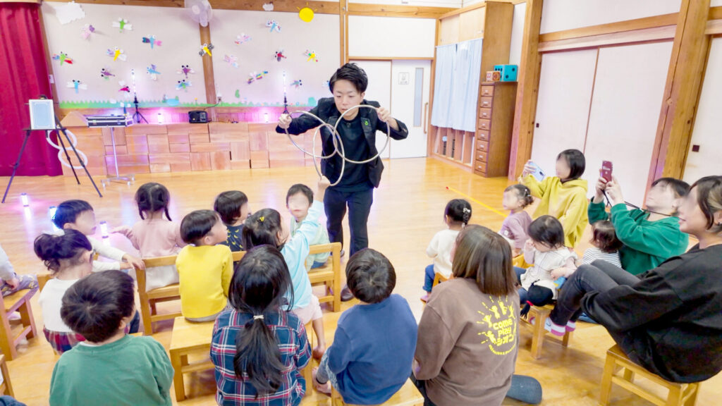 2025年10月28日、秋晴れの空が広がる中、島根県隠岐・西ノ島町にある保育園「シオンこどもえん」様にて、親御さんも一緒に楽しむ特別マジックショーを開催しました。
